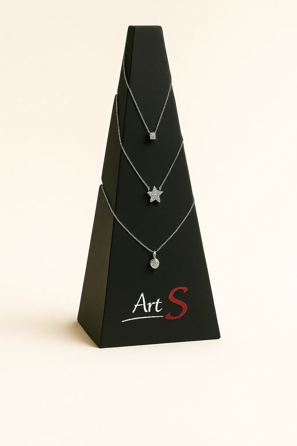 Ekspozytor jubilerski wykonany z materiałów wysokiej jakości. Przeznaczony jest do ekspozycji zawieszek, naszyjników, koli.