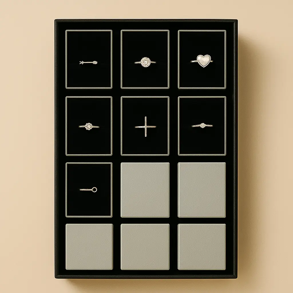 Ręcznie wykonany ekspozytor jubilerski z wysokiej jakości materiałów, oklejony papierem ozdobnym. Przeznaczony jest do ekspozycji pierścionków, obrączek, zawieszek.