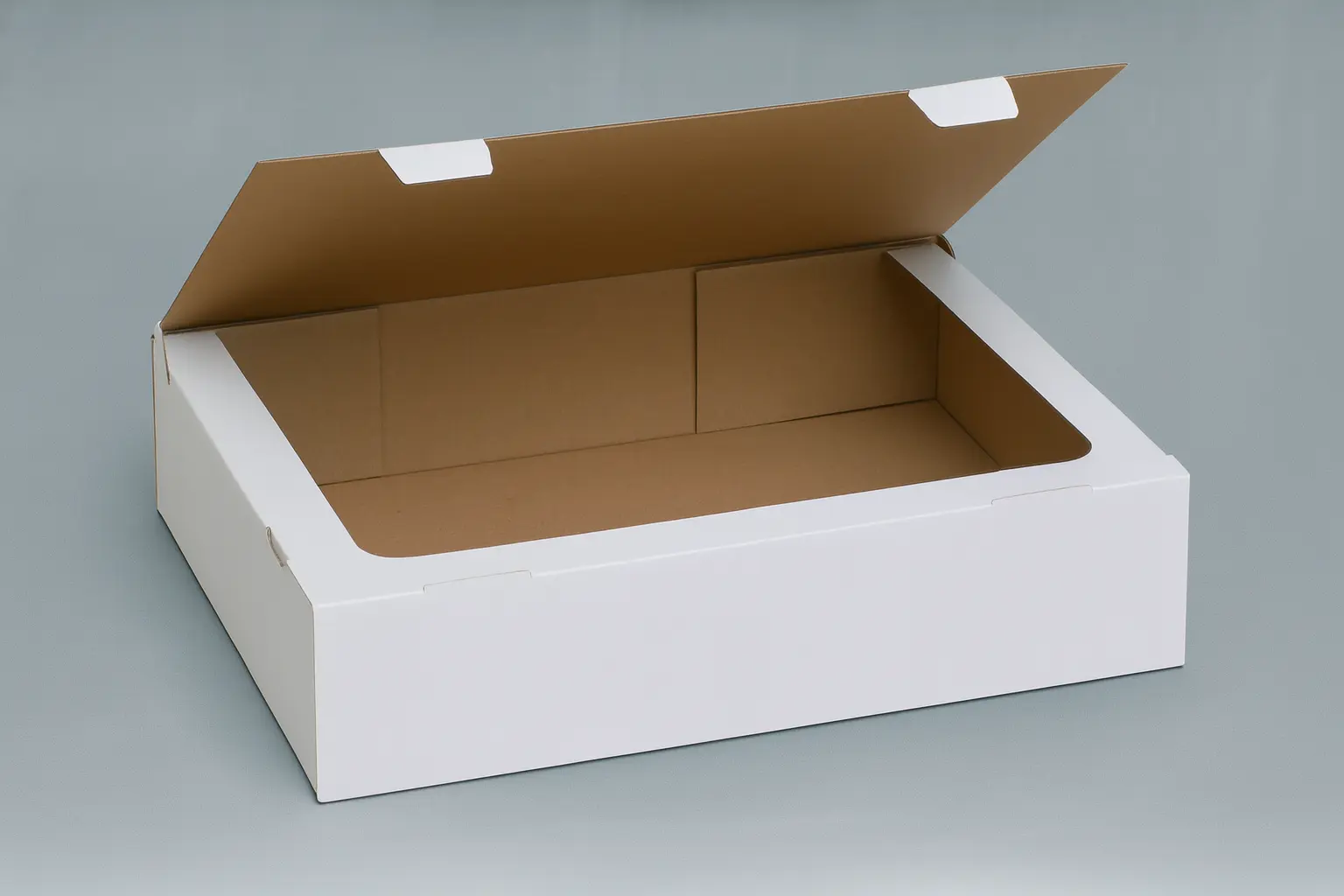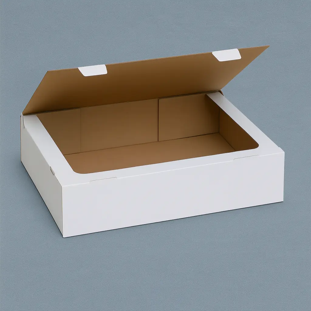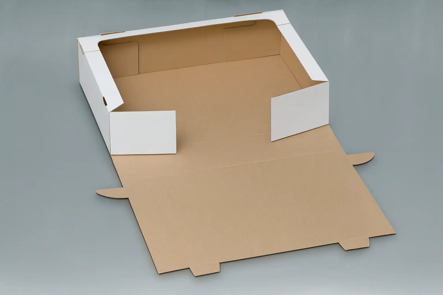 Praktyczne i stylowe pudełko kartonowe idealne do pakowania ciast, tortów i innych wypieków. Wykonane z białego, wytrzymałego kartonu. Wnętrze ze złotym podkładem podkreśla wygląd produktu i wzmacnia dno, zapewniając bezpieczny transport.
