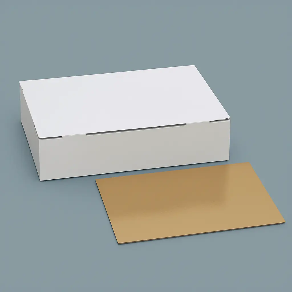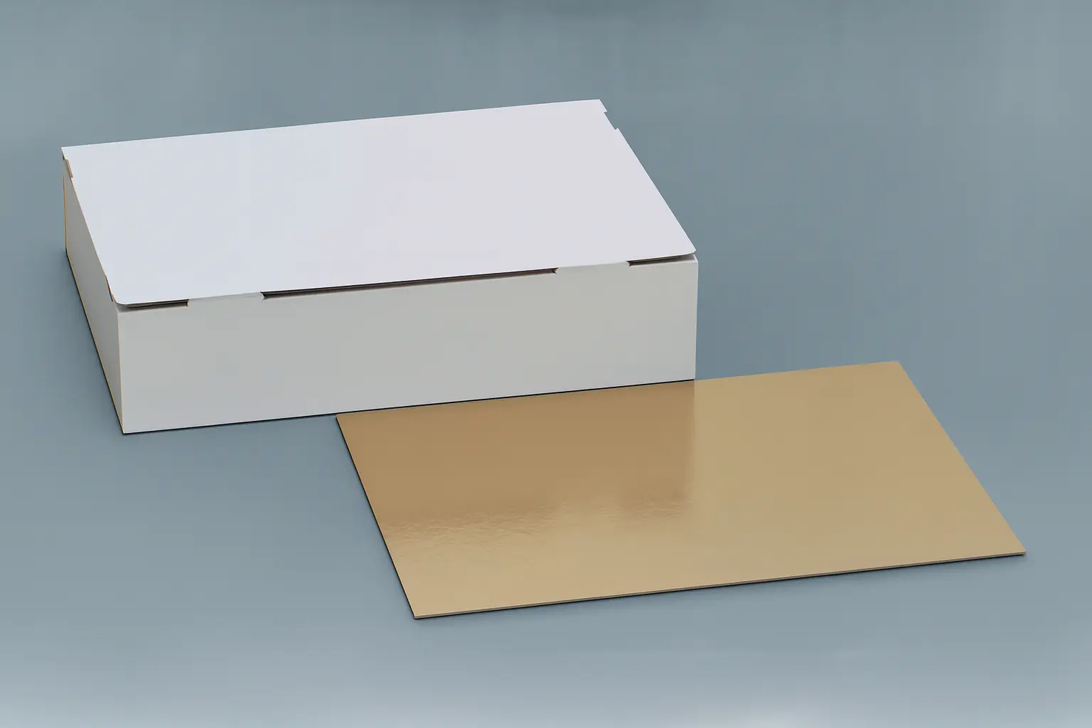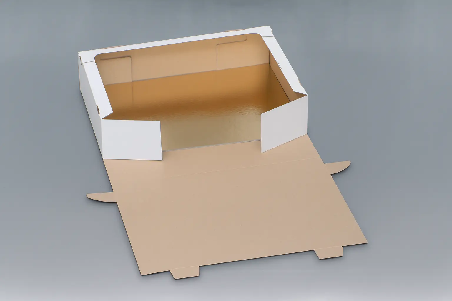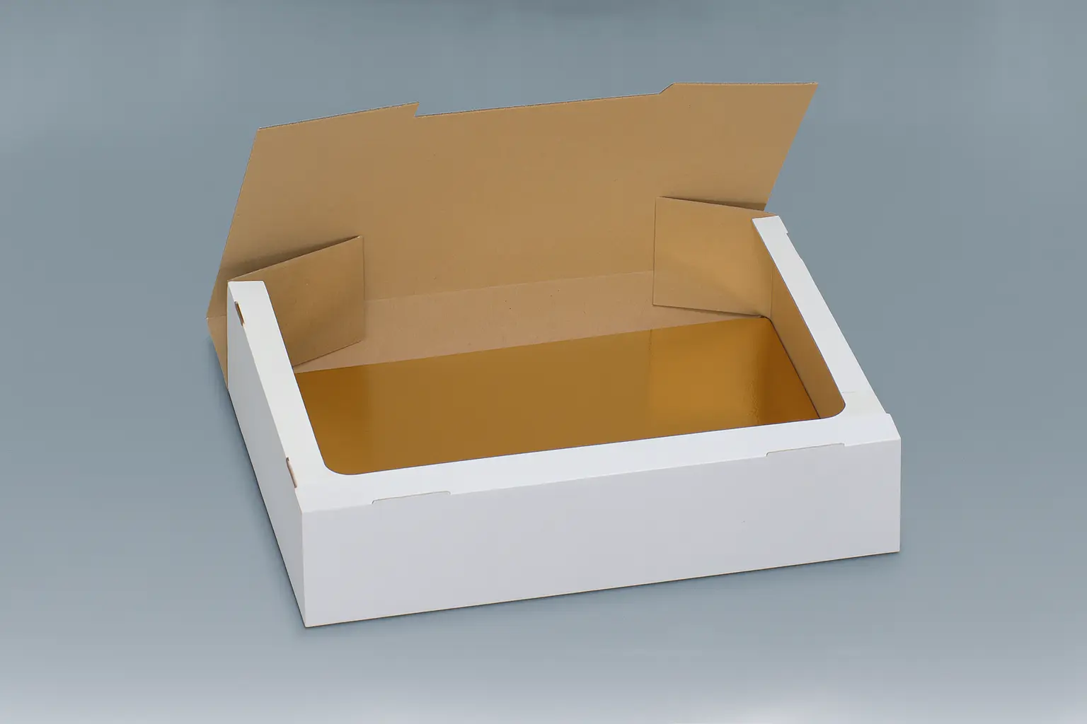 Praktyczne i stylowe pudełko kartonowe idealne do pakowania ciast, tortów i innych wypieków. Wykonane z białego, wytrzymałego kartonu. Wnętrze ze złotym podkładem podkreśla wygląd produktu i wzmacnia dno, zapewniając bezpieczny transport.