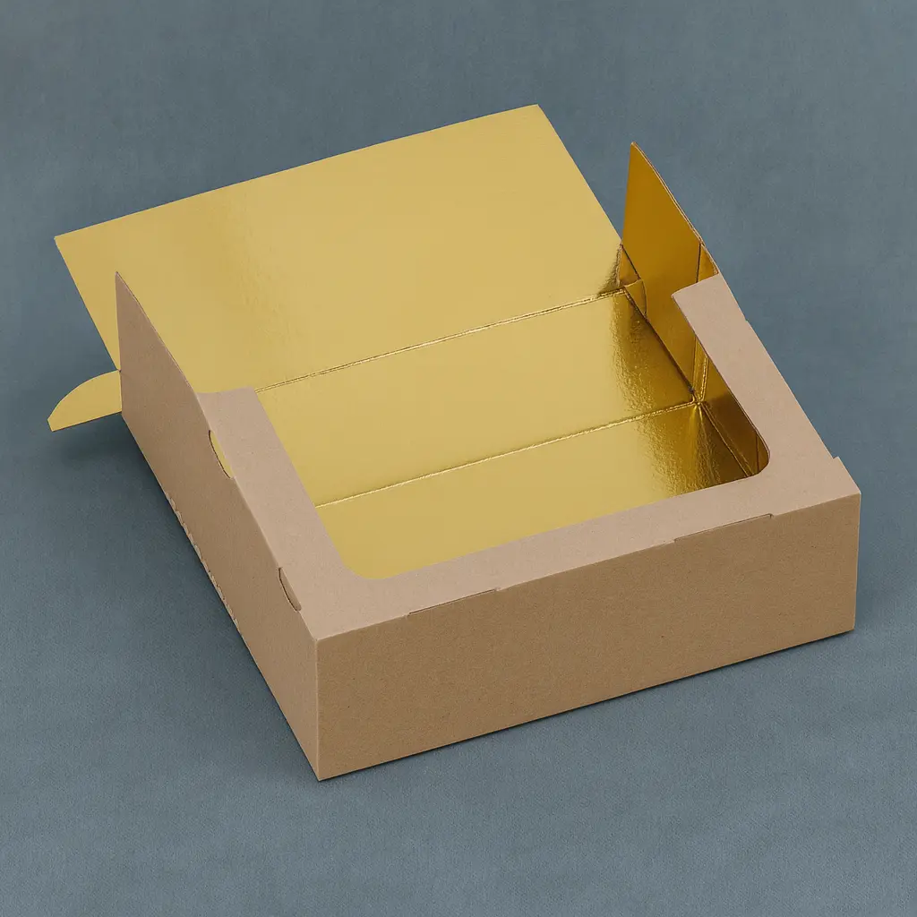 Eleganckie, naturalne pudełko cukiernicze typu C16 wykonane z solidnej tektury kraft. Składana konstrukcja z wygodną klapką gwarantuje szybkie pakowanie i pewne domknięcie, a wycięcie ekspozycyjne z przodu pięknie prezentuje zawartość.