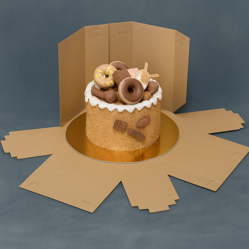 Wytrzymałe, wysokie opakowanie z tektury do efektownej prezentacji i bezpiecznego transportu deserów. Idealne na „bukiety” słodkości, pączki, cake popsy, muffiny, makaroniki, zestawy prezentowe i kompozycje okolicznościowe.