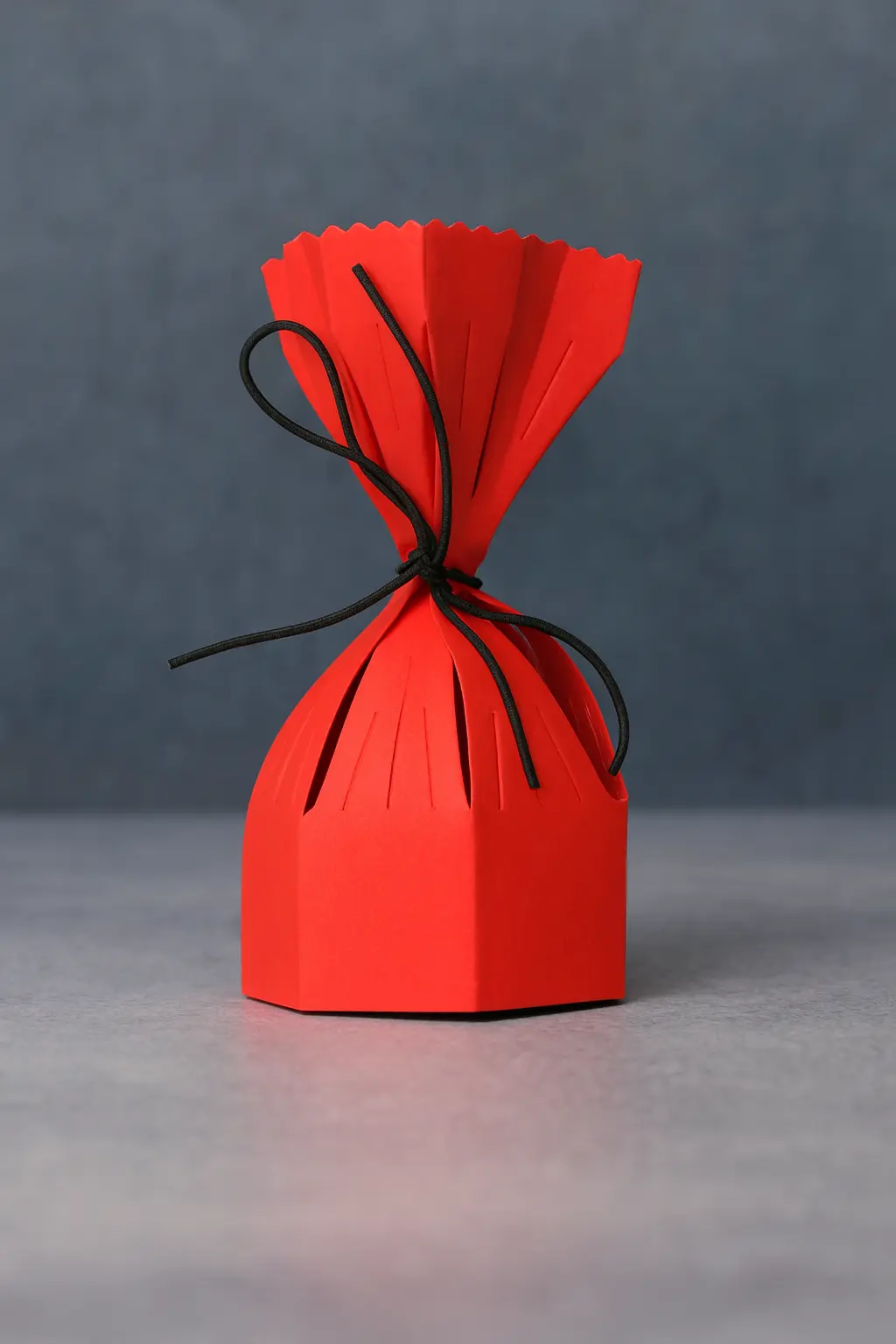 Opakowanie cukiernicze w kształcie sakiewki to stylowe i praktyczne pudełko wykonane z wysokiej jakości kartonu. Jego unikalna forma sprawia, że doskonale nadaje się do pakowania słodyczy, pralinek, ciastek czy drobnych upominków.