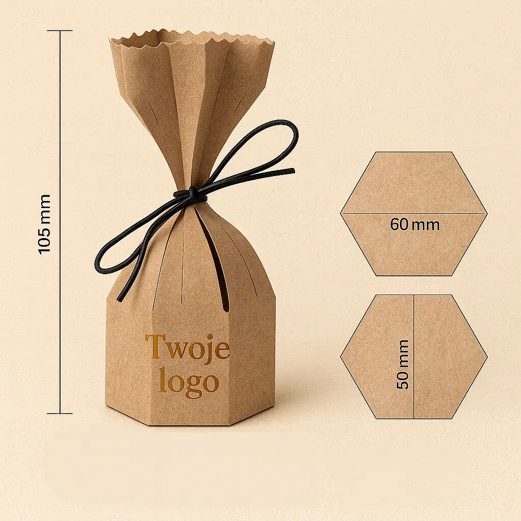 Opakowanie jest dostępne w różnych kolorach, m.in. w klasycznym kraftowym brązie oraz intensywnej czerwieni. Dzięki możliwości nadruku Twoje logo idealnie sprawdzi się jako personalizowane pudełko cukiernicze na specjalne okazje, eventy i upominki firmowe.