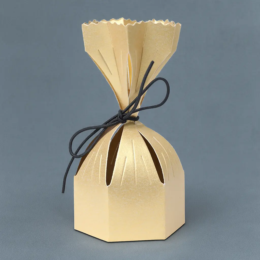 Opakowanie cukiernicze w kształcie sakiewki to stylowe i praktyczne pudełko wykonane z wysokiej jakości kartonu. Jego unikalna forma sprawia, że doskonale nadaje się do pakowania słodyczy, pralinek, ciastek czy drobnych upominków.