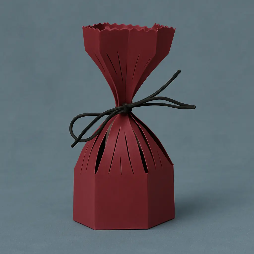 Opakowanie cukiernicze w kształcie sakiewki to stylowe i praktyczne pudełko wykonane z wysokiej jakości kartonu. Jego unikalna forma sprawia, że doskonale nadaje się do pakowania słodyczy, pralinek, ciastek czy drobnych upominków.