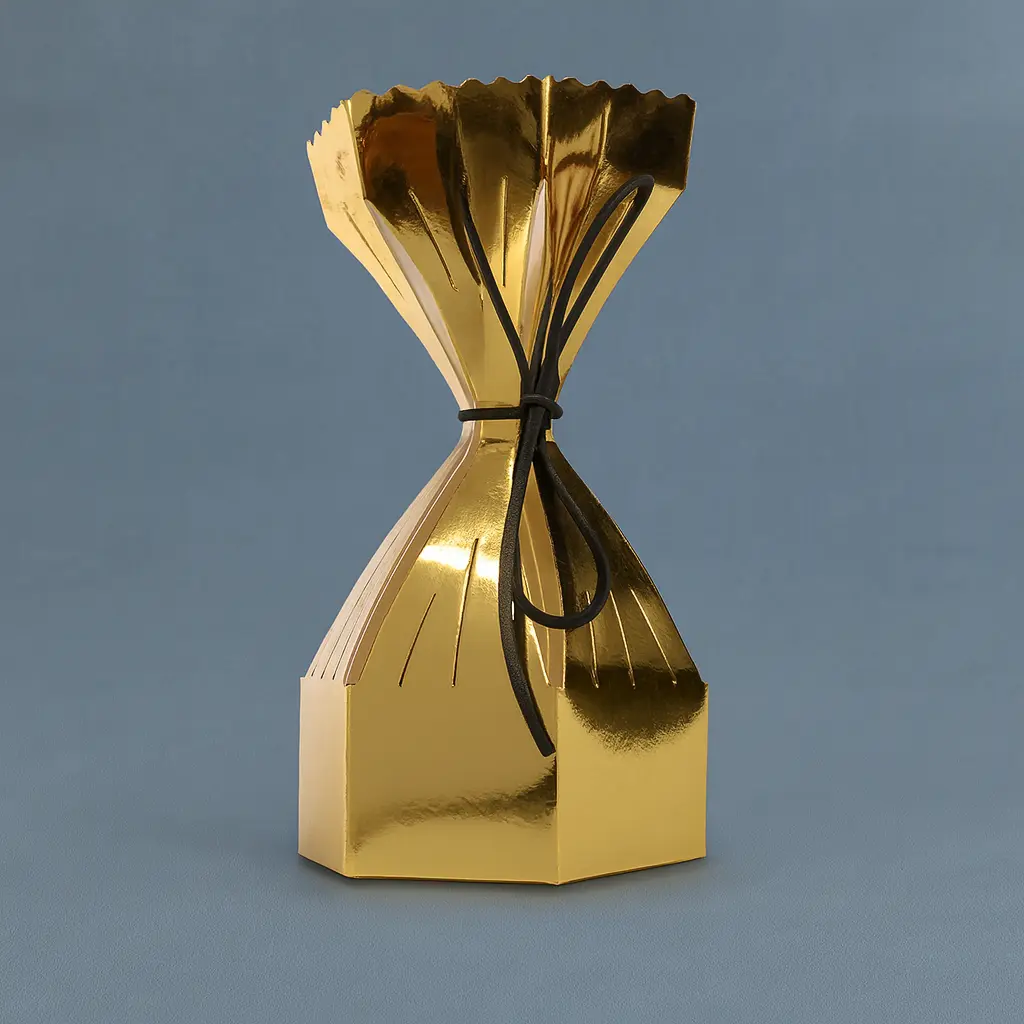 Opakowanie cukiernicze w kształcie sakiewki to stylowe i praktyczne pudełko wykonane z wysokiej jakości kartonu. Jego unikalna forma sprawia, że doskonale nadaje się do pakowania słodyczy, pralinek, ciastek czy drobnych upominków.