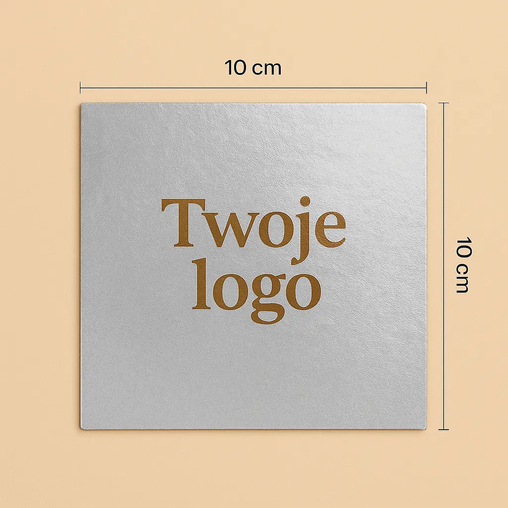 Kwadratowy podkład pod desery i mini wypieki. Sztywna, estetyczna podstawa z metalizowaną powierzchnią – elegancko prezentuje produkt i ułatwia bezpieczne przenoszenie.