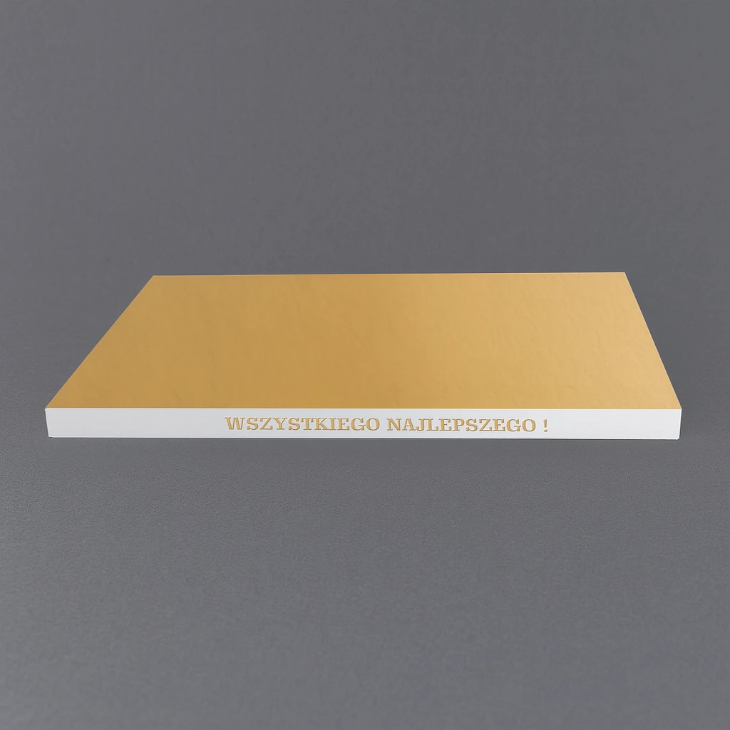 Elegancka podkładka cukiernicza wykonana z wytrzymałej płyty stratodur, pokryta złotą folią o lustrzanym połysku. Idealna do eksponowania tortów, ciast, monoporcji oraz innych wyrobów cukierniczych, nadając im wyjątkowo prestiżowy wygląd.