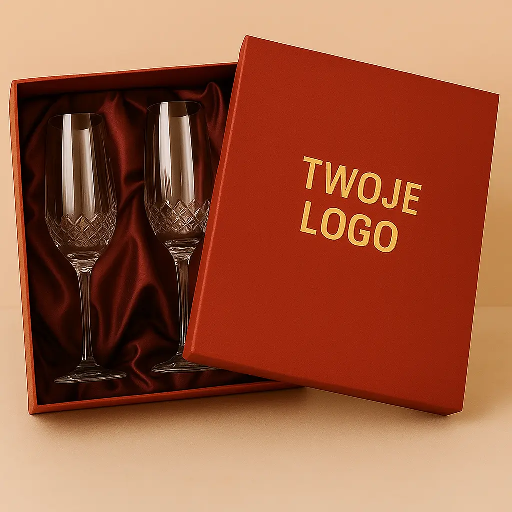 Dwuelementowa konstrukcja typu „denko i wieczko” z dopasowaną wkładką piankową zapewnia stabilność i ochronę kieliszków, a jednocześnie efektownie je eksponuje. To idealne opakowanie prezentowe dla zestawów ślubnych, upominków firmowych, alkoholi premium lub produktów kolekcjonerskich.