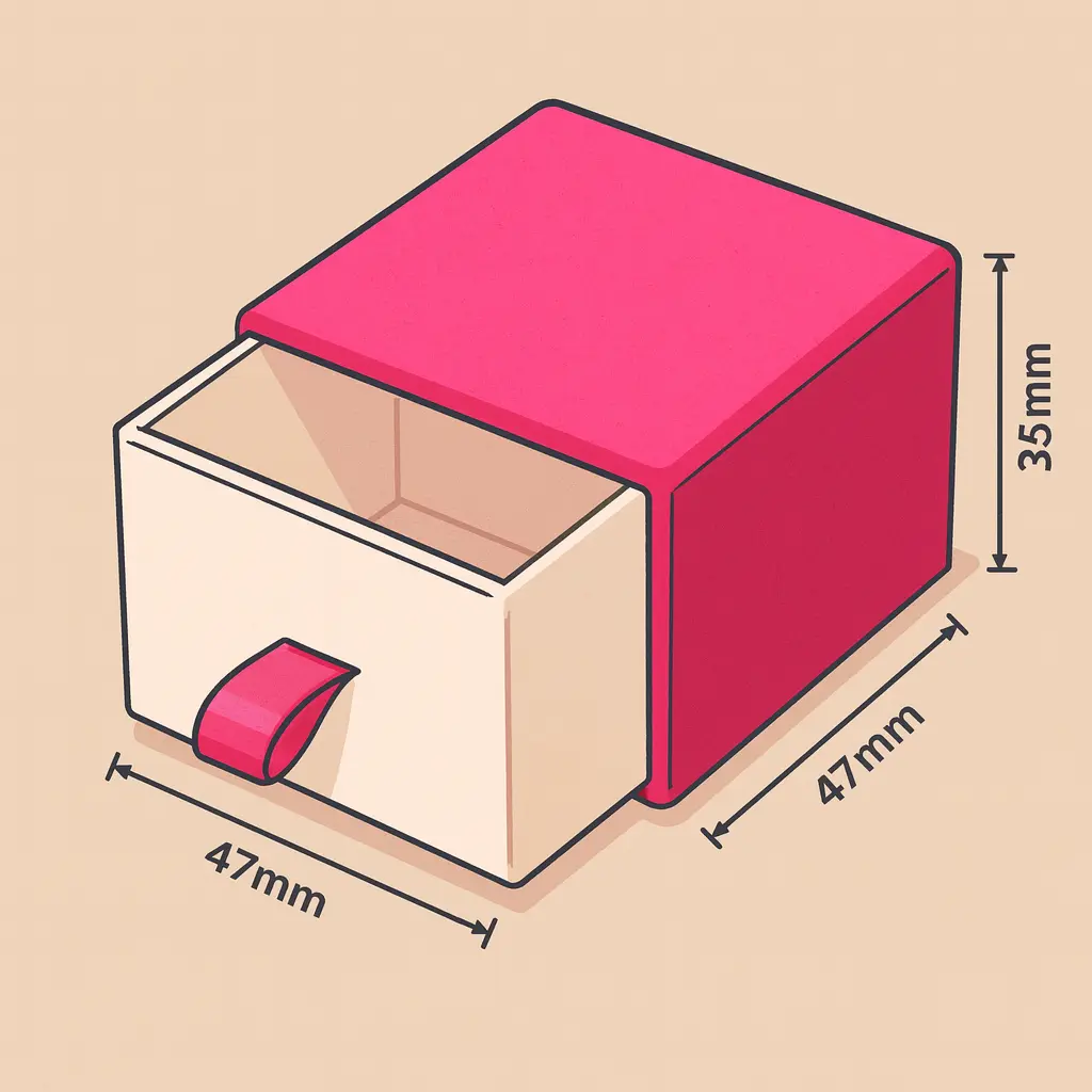 P194 to kompaktowe, eleganckie opakowanie szufladkowe o wymiarach 47 × 47 × 35 mm, stworzone z myślą o drobnych, ekskluzywnych produktach. Jego minimalistyczna forma z wysuwaną szufladką i ozdobną wstążką sprawia, że nawet niewielki przedmiot zyskuje prestiżową oprawę.